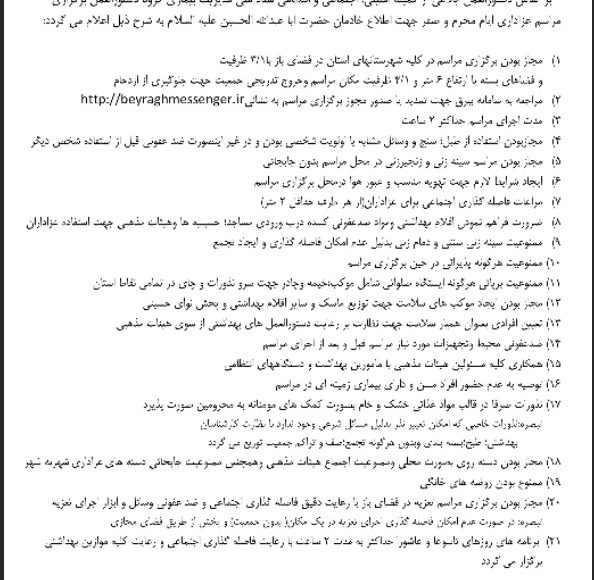 سرپرست معاونت فرهنگی، پژوهشی و آموزشی اداره کل تبلیغات اسلامی بوشهر ضدعفونی محیط و تجهیزات مورد نیاز مراسم قبل و بعد از اجرای مراسم، همکاری کلیه مسئولین هیئات مذهبی با مامورین بهداشت و دستگاههای انتظامی، توصیه به عدم حضور افراد مسن و دارای بیماری زمینهای در مراسم، و مجاز بودن دستهروی به صورت محلی و ممنوعیت اجتماع هیئات مذهبی و همچنین ممنوعیت جابجائی دستههای عزاداری شهر به شهر را از جمله نکات دیگر این دستورالعمل ذکر کرد.