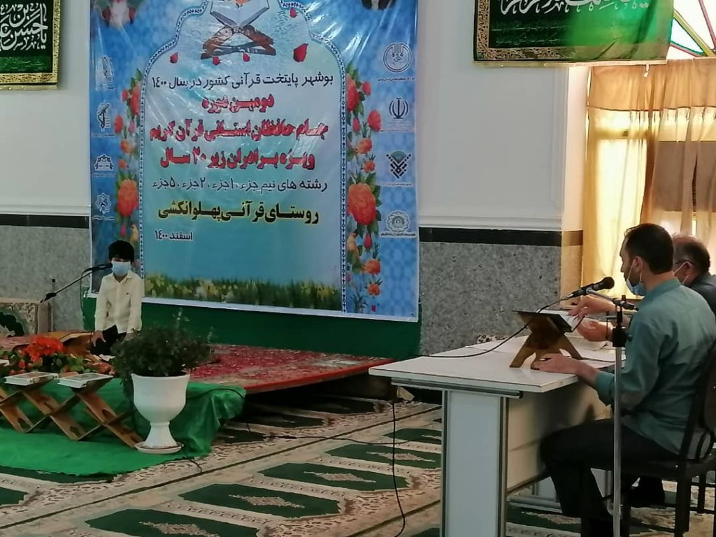 رئیس اداره امور قرآنی تبلیغات اسلامی استان بوشهر گفت: با هدف شناسائی استعدادهای قرآنی در زمینه حفظ قرآن کریم و ارزیابی آنان، اولین دوره مسابقات قرآنی ویژه حافظان قرآن کریم پسر و در رده سنی زیر ۲۰ سال، در ۳ رشته حفظ نیم جزء، حفظ ۱ جزء و حفظ ۳ جزء قرآن کریم، آبان سالجاری در روستای قرآنی چاهکوتاه برگزار شد.