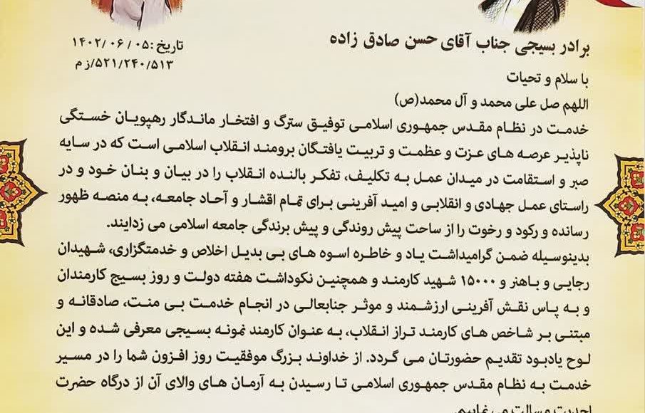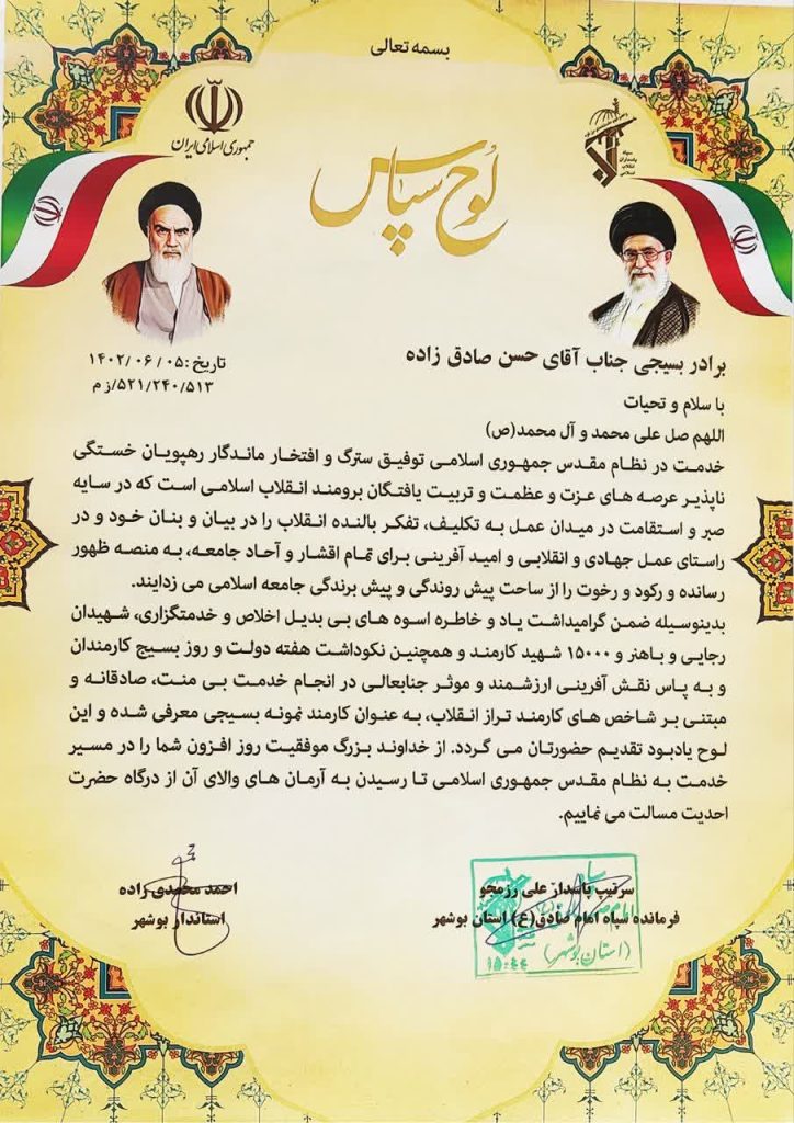 به گزارش روابط عمومی اداره کل تبلیغات اسلامی بوشهر، احمد محمدیزاده استاندار، و سرتیپ پاسدار علی رزمجو فرمانده سپاه امام صادق این استان 5 شهریور 1402 با اهداء لوح سپاس از حجتالاسلام حسن صادقزاده، سرپرست معاونت فرهنگی پژوهشی و آموزشی اداره کل تبلیغات اسلامی بوشهر تقدیر به عمل آوردند.