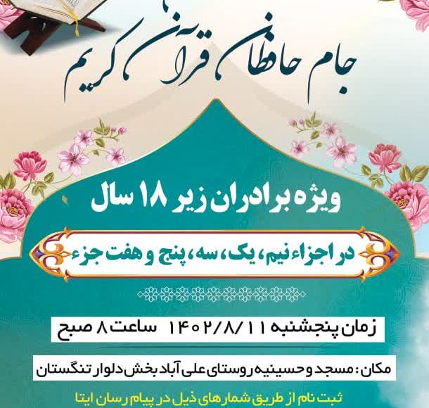 احمدی منفرد هم چنین خاطر نشان کرد : علاقمندان به شرکت در این دوره می توانند تلاوت مبنا تقلیدی (انتخاب آزاد) به شماره 09171740810 در پیام رسان ایتا و جهت نام نویسی شرکت در دوره به شماره های09171740810 و 09173763879 از طریق پیامک و پیامرسان ایتا نام ارسال نمایند .وی در پایان افزود این دوره مسابقات با همکاری اداره امور قرآنی تبلیغات اسلامی استان ، مجمع قرآنیان استان ، اتحادیه موسسات فرهنگی قرآن و عترت استان و ستاد برگزاری مراسمات فرهنگی روستای علی آباد بخش دلوار تنگستان برگزار خواهد شد.