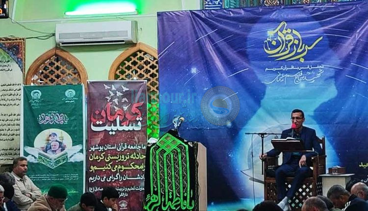 دراین محفل معنوی که احمد محمدی زاده استاندار بوشهر و جمعی از مدیران دستگاه های اجرایی استان نیزحضور داشتند : حجت الاسلام دارابی اعزامی از موسسه تدبر شهر قم ، از مهمترین عوامل حادثه تروریستی کرمان را ترس دشمنان اسلام به ویژه اسرائیل از اقتدار ایران و سردارانی همچون شهید سلیمانی دانستند و افزودند به فرموده رهبر معظم انقلاب، دشمنان از شهید سلیمانی بیش از سردار سلیمانی می ترسند و در جایی دیگر که رهبر معظم انقلاب فرمودند اسرائیل 25 سال آینده را نخواهد دید چنان ترسی در دل دشمن افتاده که امروز در جنگ غزه هم که فلسطینیان با دست خالی در مقابل اسرائیل می جنگند می توان بدین مهم پی برد. گفتنی است در حاشیه این محفل به قید قرعه از سوی دبیرخانه کانونهای خدمت رضوی استان بوشهر به سه نفر سفر زیارتی مشهد مقدس اهدا شد.