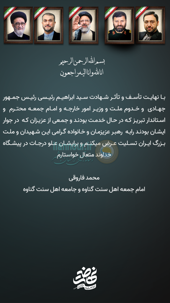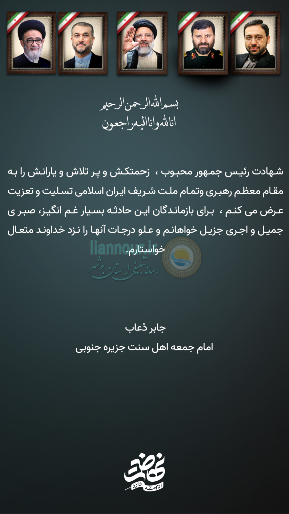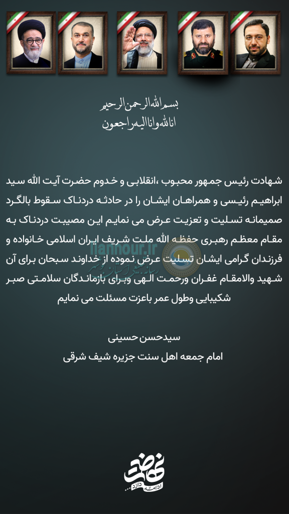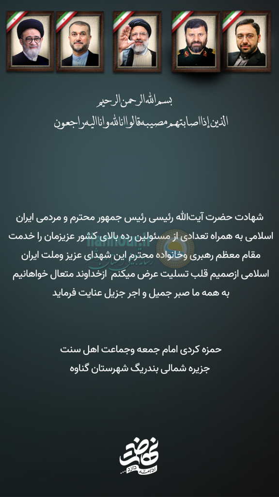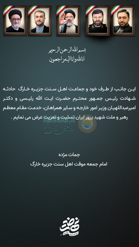 انا لله وانا الیه راجعون،این جانب از طرف خود وجماعت اهل سنت جزیره خارگ حادثه شهادت ریس جمهور محترم حضرت ایت الله ریسی ودکتر عبداللهیان ریسی امور خارجه وسایر همراهان خدمت مقام معظم رهبرب وملت شهید پرور ایران تسلیت وتعزیت عرض می نمایم.
