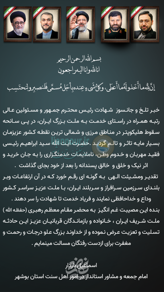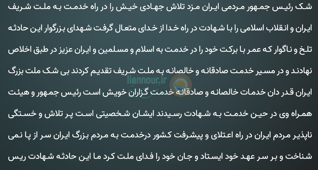 خبر تلخ و جانسوز شهادت رئیس محترم جمهور و مسئولین عالی رتبه همراه در راستای خدمت به ملت بزرگ ایران، در پی سانحه سقوط هلیکوپتر در مناطق مرزی و شمالی ترین نقطه کشور عزیزمان ، بسیار مایه تاثر و تالم گردید .