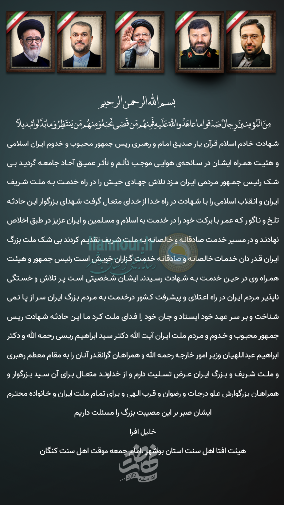 در بخشی از پیام تسلیت خلیل افرا، عضو هیئت افتا اهل سنت استان بوشهر و امام جمعه موقت اهل سنت کنگان آمده است: بی شک ملت بزرگ ایران قدر دان خدمات خالصانه و صادقانه خدمت گزاران خویش است رئیس جمهور و هیئت همراه وی در حین خدمت به شهادت رسیدند ایشان شخصیتی است پر تلاش و خستگی ناپذیر مردم ایران در راه اعتلای و پیشرفت کشور درخدمت به مردم بزرگ ایران سر از پا نمی شناخت و بر سر عهد خود ایستاد و جان خود را فدای ملت کرد.