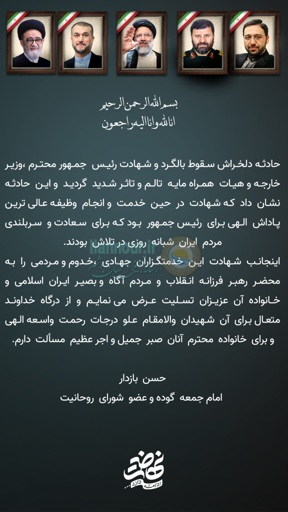 با نهایت تأسف و تأثر شهادت سید ابراهیم رئیسی رئیس جمهور جهادی و خدوم ملت و وزیر امور خارجه و امام جمعه محترم و استاندار تبریز که در حال خدمت بودند و جمعی از عزیزان که در جوار ایشان بودند رابه رهبر عزیزمان و خانواده گرامی این شهیدان و ملت بزرگ ایران تسلیت عرض میکنم و برایشان علو درجات در پیشگاه خداوند متعال خواستارم.