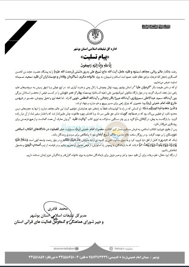 پیام تسلیت مدیرکل تبلیغات اسلامی بوشهر برای درگذشت آیت الله بدری دشتی